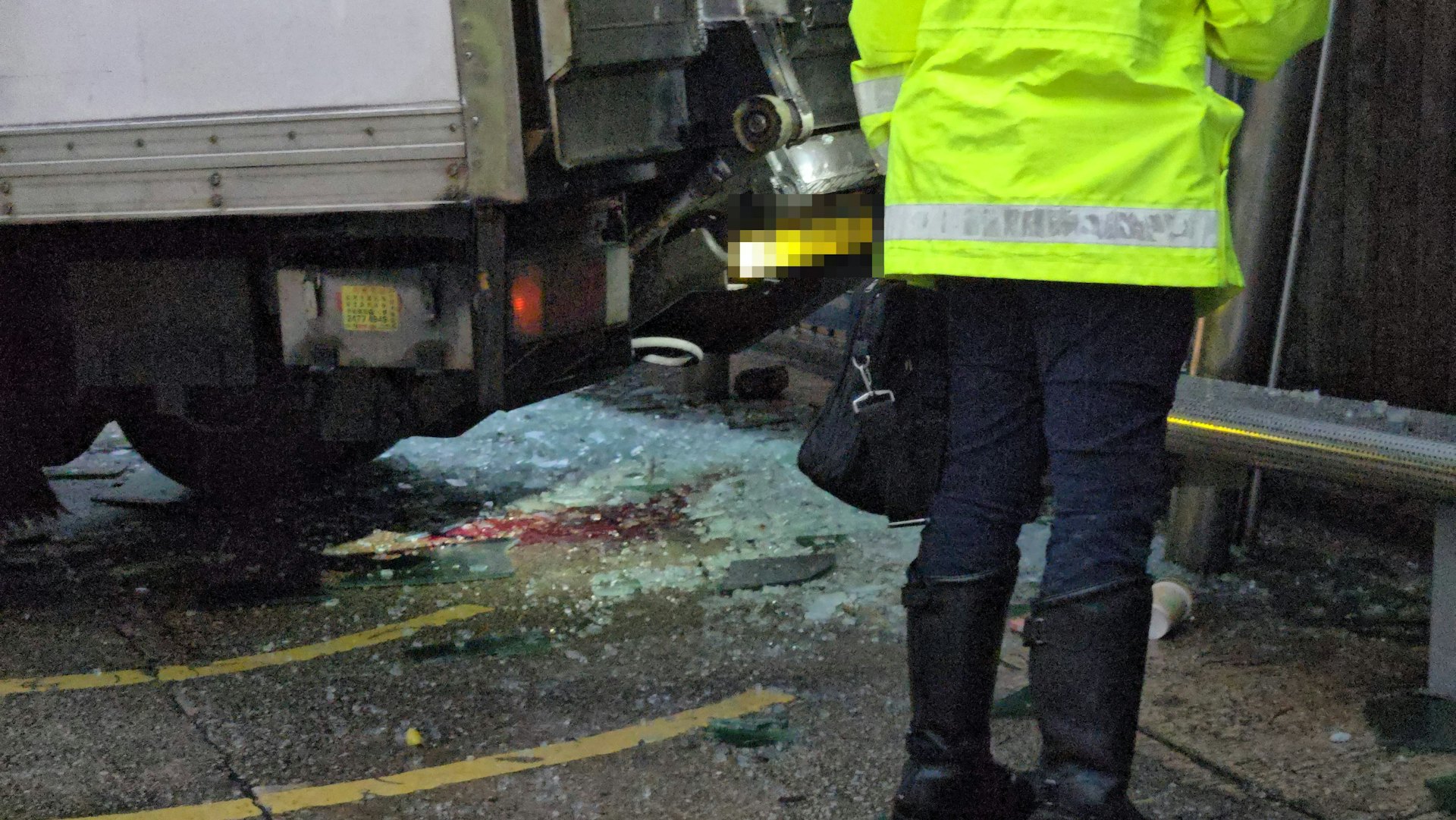 3 Q! R. U* E! X- N5 P# d/ \貨車剷上巴士站撞到兩名女途人,一死一傷。(黃偉民攝)