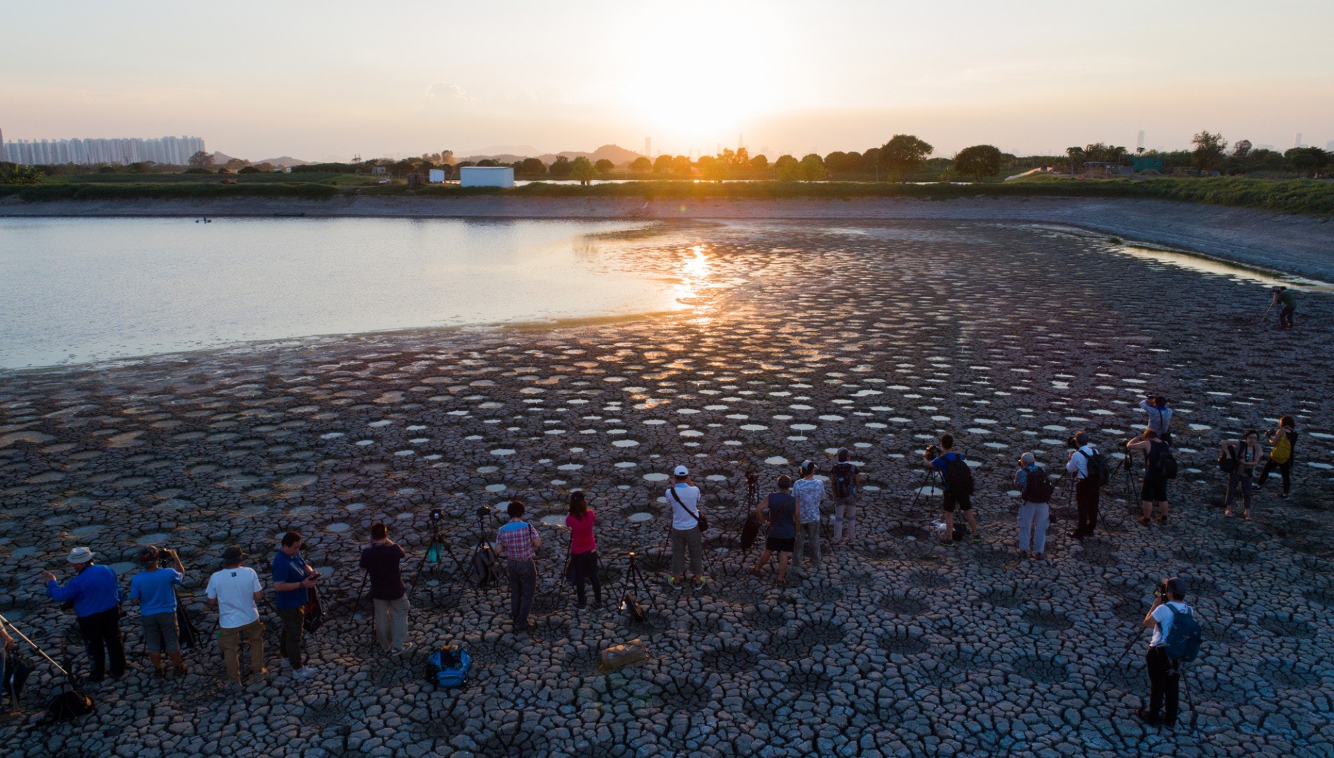 天氣幾熱、太陽多曬,也難阻攝影愛好者拍攝難得一見的大生圍「月球坑」。(余俊亮攝)