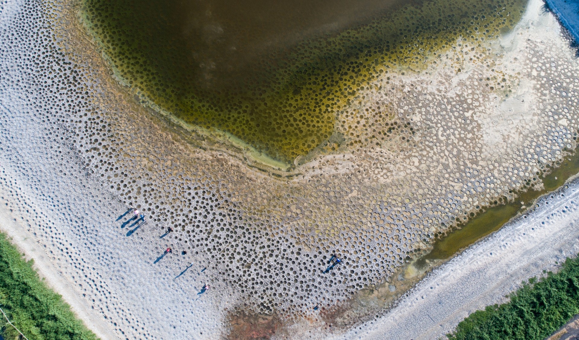 , U6 U8 z4 ?! j3 x. d不少攝影愛好者近日紛紛湧至大生圍一個魚塘拍攝「圓洞旱照」。從照片可見,魚塘乾至龜裂,中間出現一個個大小不一的圓坑。攝影師Edward Tin亦拍得此景,他形容大生圍魚塘乾枯,形成一個個洞,頗有「異星感」:「在仍有水份下有一片片金黃色的水藻,產生一種異星感,完全乾枯的則呈現龜裂紋理,表面如鍍了一層薄薄的霜。」更有網民形容情況是「熱到星球都爆開 」。