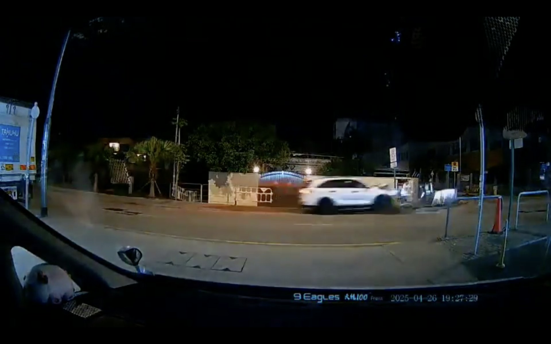 & r$ b; `3 z6 U/ Ftvb now,tvbnow,bttvb該輛SUV沿龍馬路方向行駛,懷疑失控,鏟上路邊鐵欄再撞飛路牌。(讀者提供)