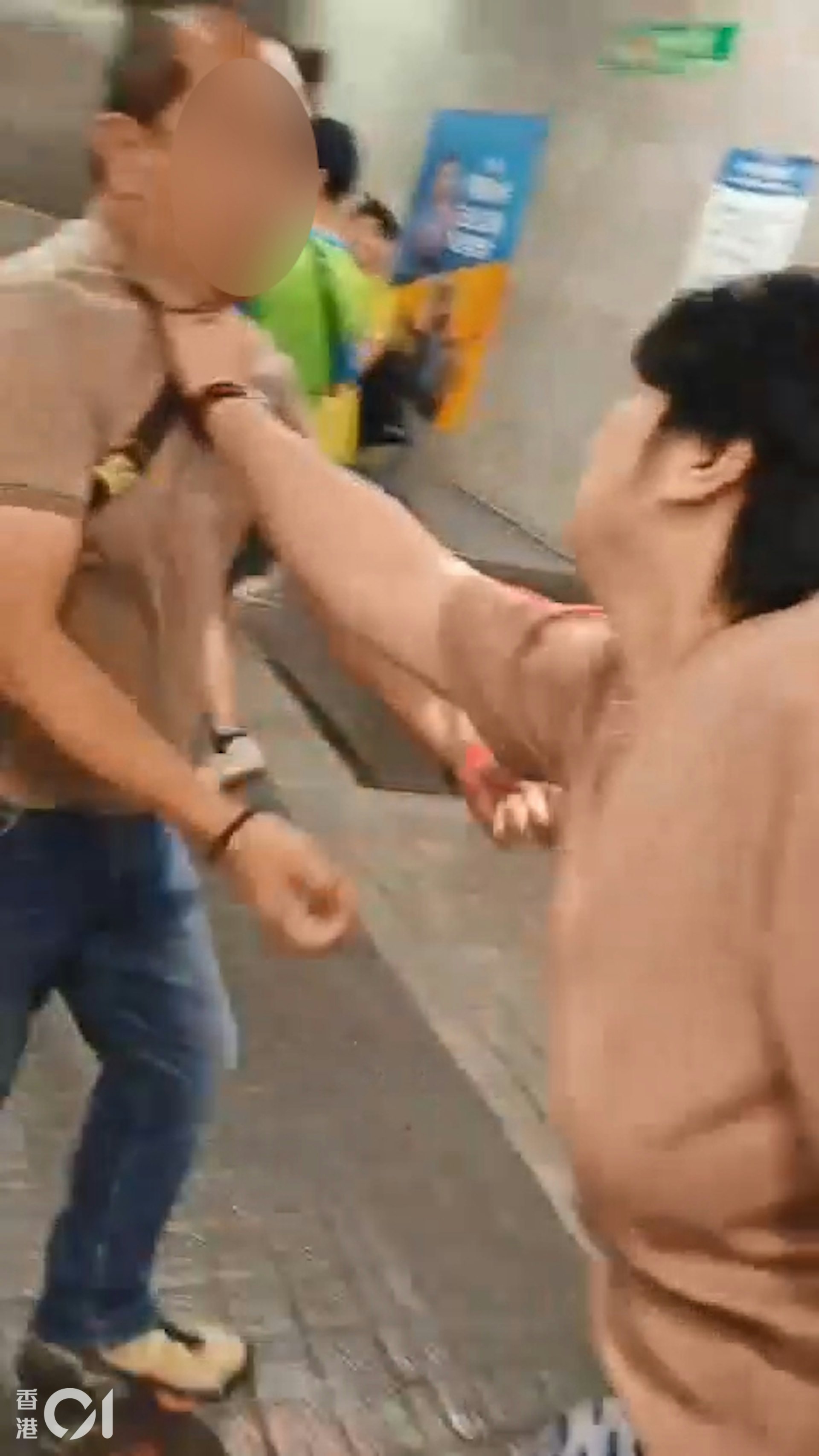 # K g, l7 a; `8 l3 ]* |( @" R有份勸阻青年的事主唐先生(左)被青年出手叉頸。(受訪者提供影片截圖)公仔箱論壇* Y8 h+ L5 B# L: V" M