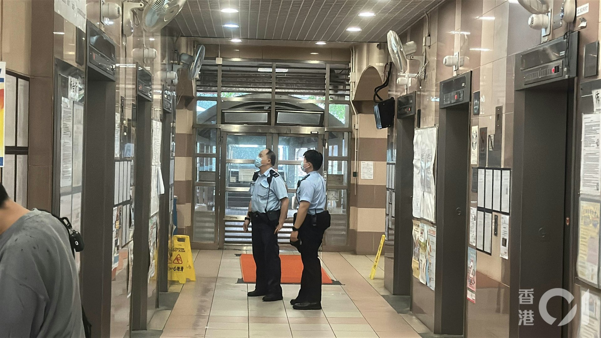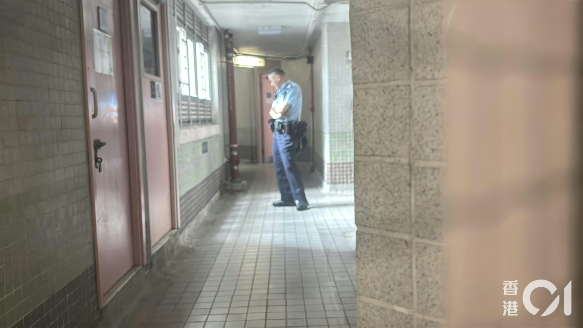 7 O+ G8 V4 P/ H* c9 Z今午有警員仍在事發樓層看守。(香港01記者攝)